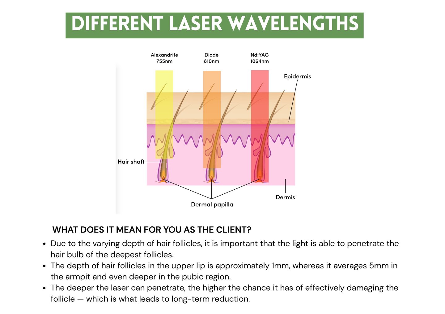 Its deeper penetration doesn’t just mean safety — it also means better results. The 1064nm wavelength leads to more effective, long-term hair reduction by reaching the follicle more efficiently than shorter wavelengths.
