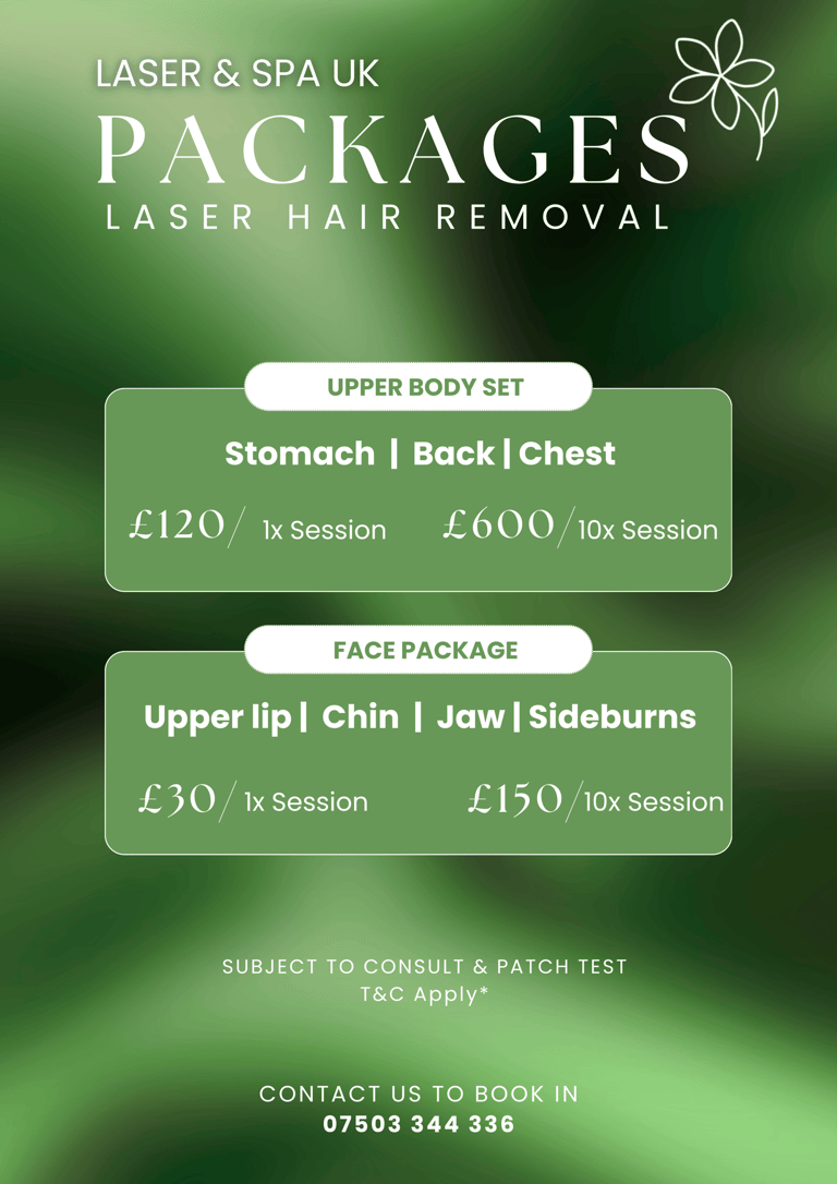Our laser hair removal is available as individual sessions or as part of a package, covering areas from the face and upper body to full legs and full body. Flexible payment options are also available to help spread the cost. All treatments are subject to a consultation and patch test where required.