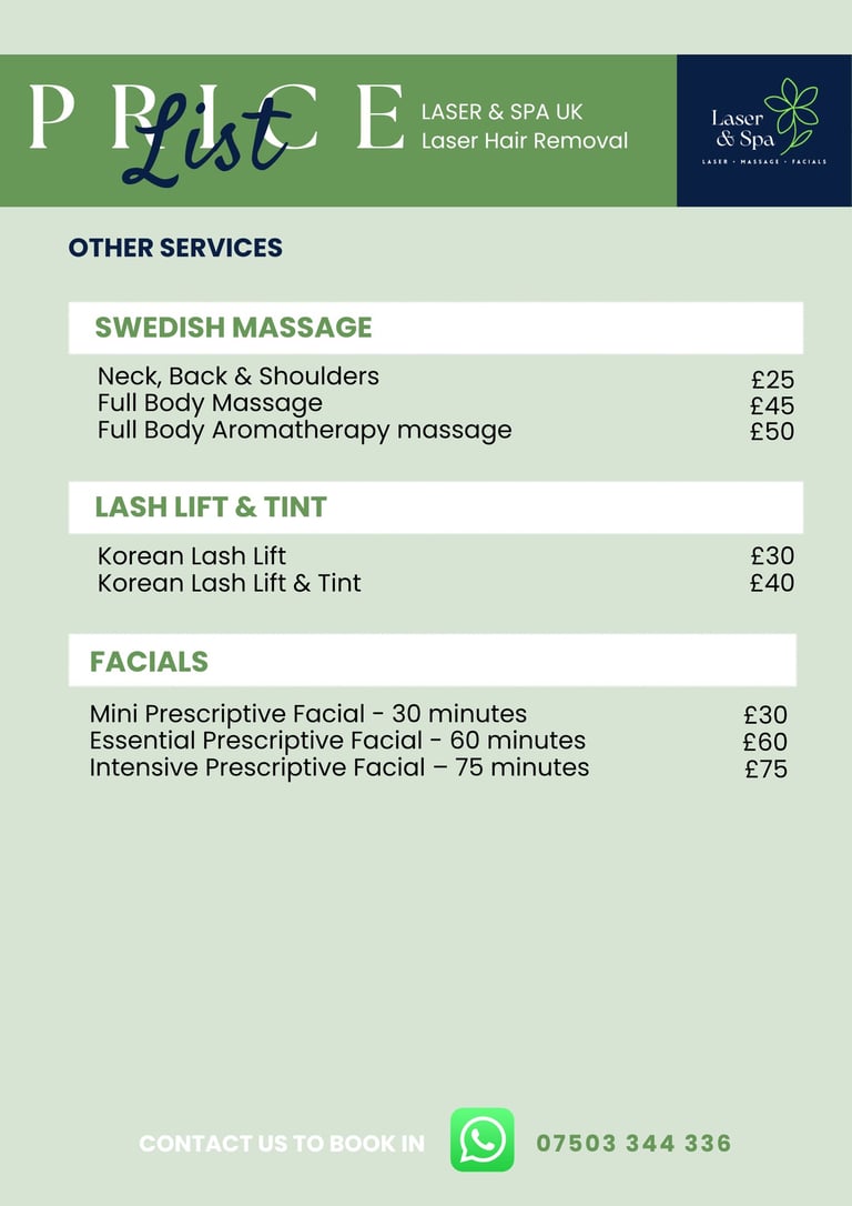 At Laser & Spa UK in Stockport, we offer transparent, honest pricing across all of our treatments. Our laser hair removal packages offer up to 50% savings on sessions of 10, alongside individual pricing for every area of the body. We also offer luxury Eve Taylor facials, Swedish massage and Korean Lash Lift and Tint, with clear pricing across every treatment.